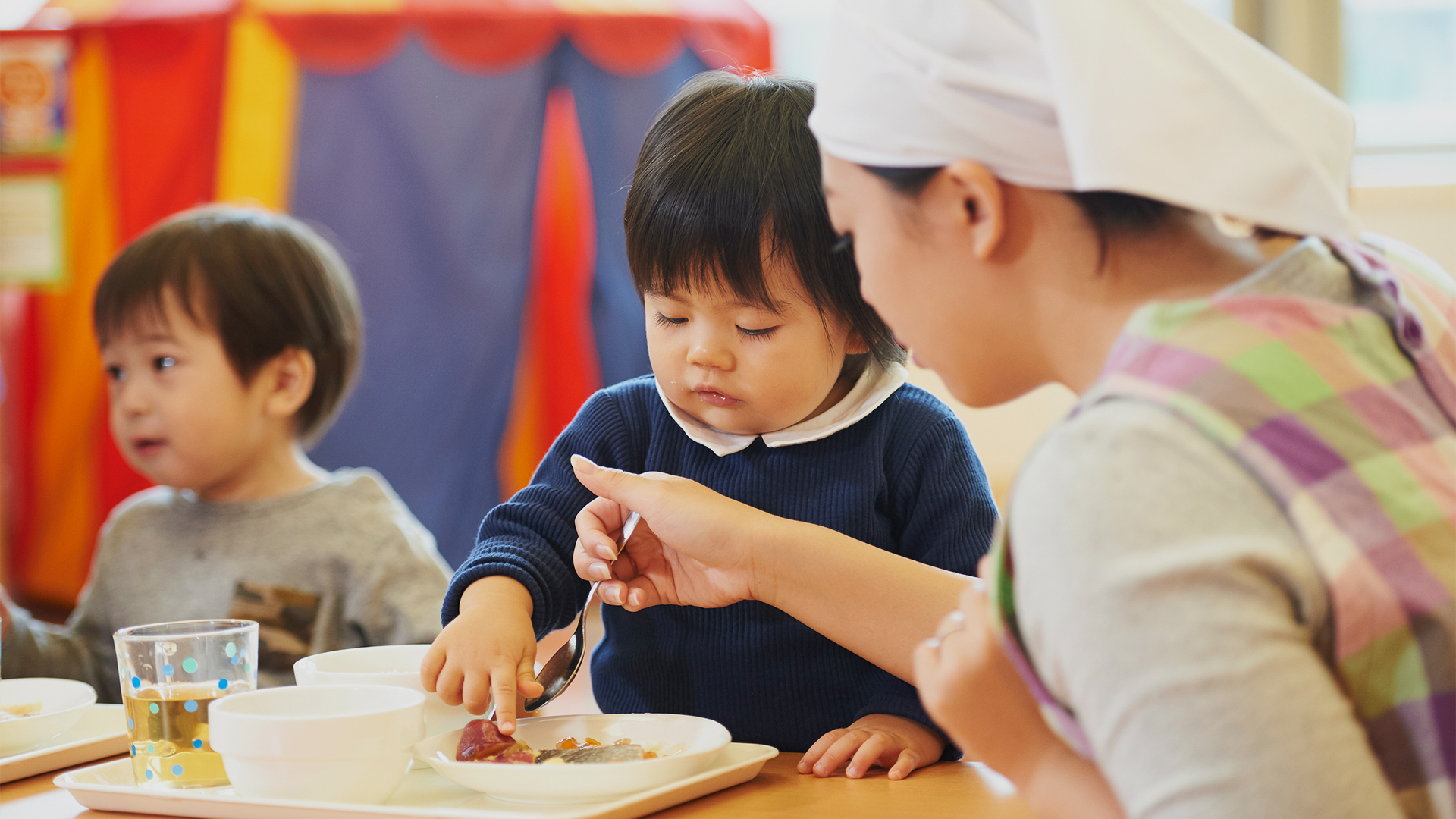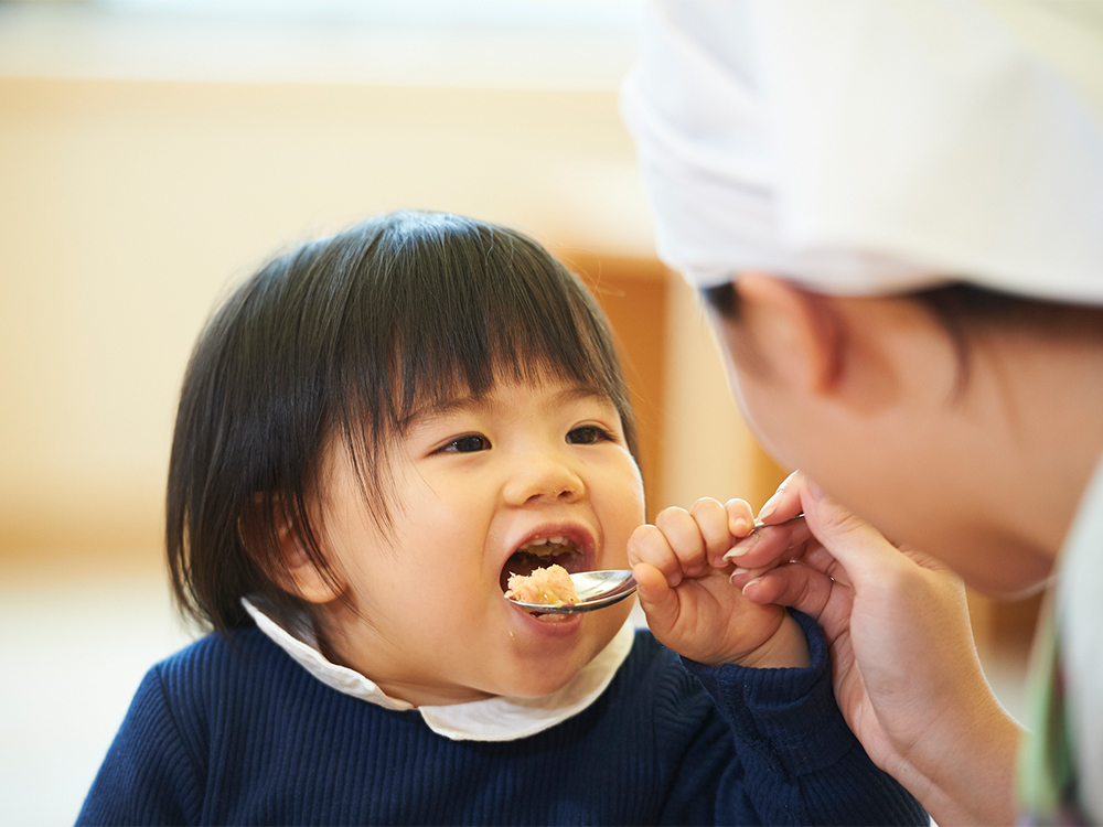 乳幼児期は、食べる意欲の土台を育むかけがえのない時期。「食べ物への感謝」「楽しく食べる喜び」を大切に、クッキング活動やエプロンシアター、バイキング給食を通して、友達や周りの人と関わりながら、思いやりや協調性を学びます。